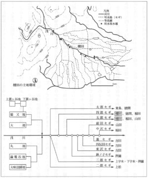 こちら「長野市デジタルミュージアム」に浅川の水利組織についてのまとめがあった。そこに左の浅川用水路の水系概念図も掲載されていた。 水量が決して豊富でない浅川の水をどうやって水田に工面してきたかをうかがい知ることができる |