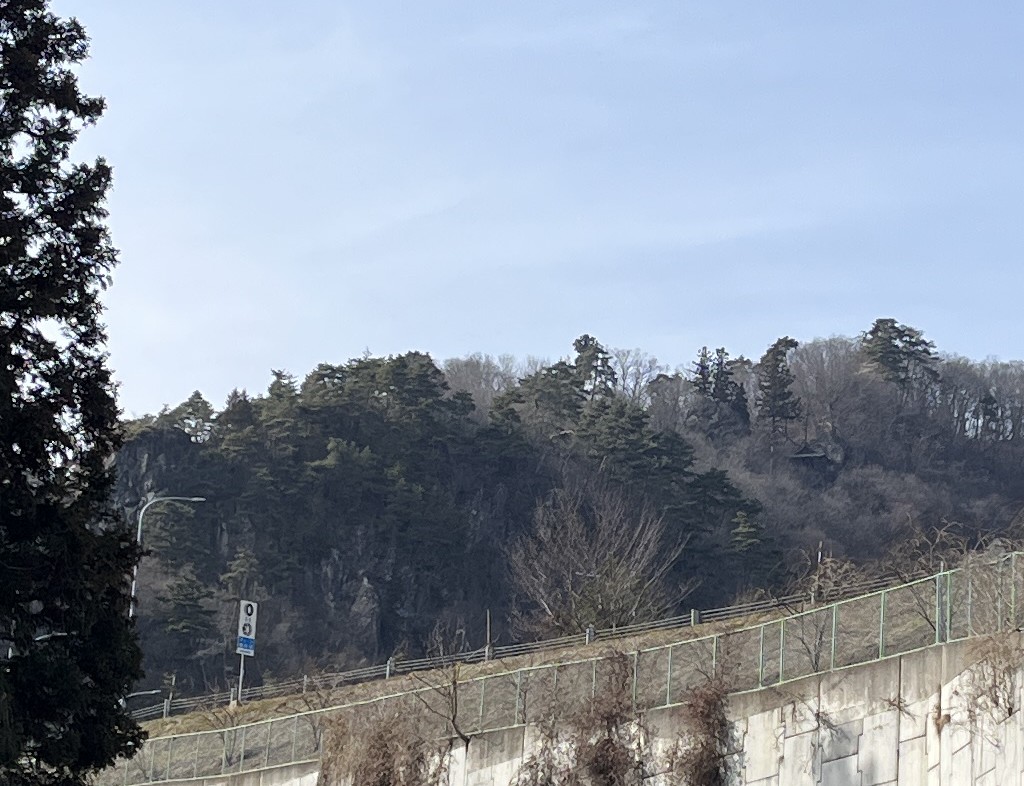 ふと見上げると「ブランド薬師」のお堂と左の「物見の岩」が見えた。 (ブランド薬師:元もとは「ぶーらん堂」の薬師如来さま;お堂が崖に板バネでブランぶらん懸架されていたところからの命名らしい?) 詳しくはこちら「日本の懸造り:ブランド薬師」 |