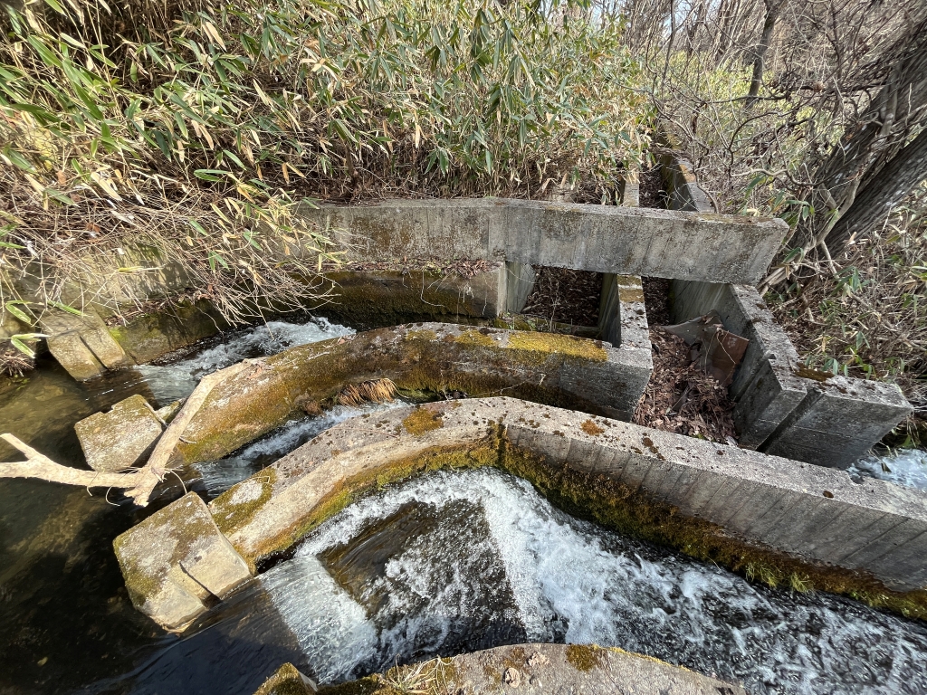 もう少し上までいったら、こんな複雑な取水堰を見つけた。ここで三本または四本に分かれているようだ。 |
