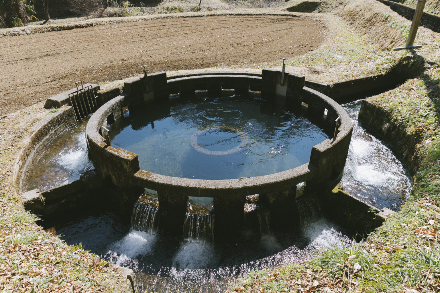 1980年代までは浅川地区でも目にした「分水器」。均等に、見た目にも解りやすく水を分配する仕組みに、昔のひとの知恵に本当に感心した覚えがある。 これは「円形分水(音無井路円形分水)」 |