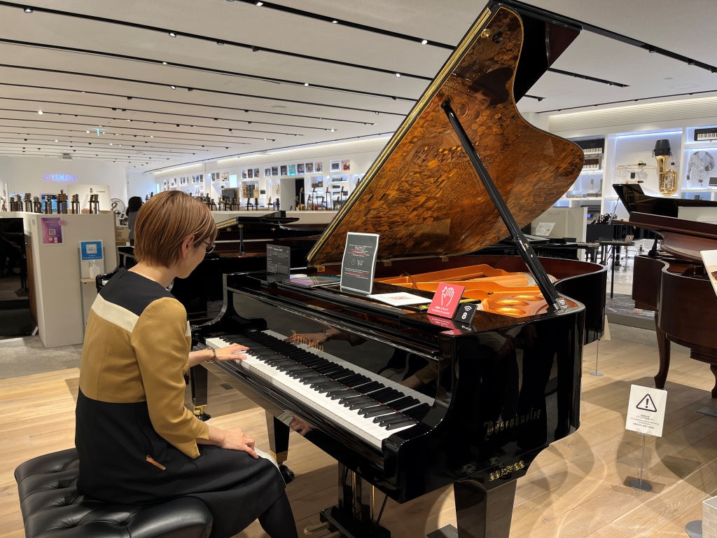 このミュージアムの説明員の方によるデモンストレーションがある。これはBösendorfer(ベーゼンドルファー)という世界に数台しかないピアノだそうな。ヤマハの傘下になってここにある貴重なものだとか。天板裏がクリムトの「黄金のアデーレ」だ。