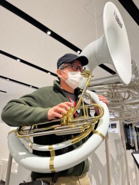 ヤマハの金管楽器の展示も豊富。ブラスバンド用のホルンを担いだ写真が撮れるアクティビティがあったのでやらせてもらった。「ブオー、ブオー、ブオー」カッコいい!