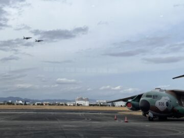 展示場の外に滑走路がある。建物の中から右下のC-2輸送機を見ていたら、2機離陸していった。今日は何度か訓練の離陸があってラッキーだった。
