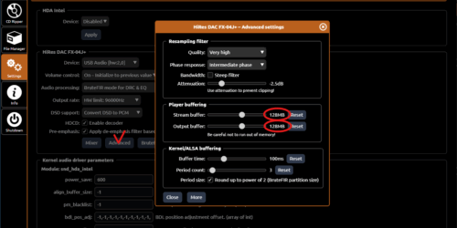 (1) 音飛びするごく稀に一瞬だけ音が欠ける(気になりだすと嫌なもの)Settings>Audio Device>DAC>Advancedボタン →Player Buffering>Stream buffer: