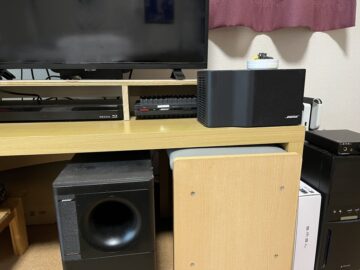 これまでのkunのオーディオ構成は「Mac Mini[HDMI] –> テレビ[RCA] –> メインアンプ –> スピーカ」(Mac Miniのイヤホンジャック;Mac内蔵のDACを使って;からもアナログは出ているけど、REGZAテレビ内蔵のDACを利用したほうが音がいいので)だったけど、これより格段に音がよくなった。サブウーハーも追加してやったらもう言うことなし。