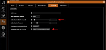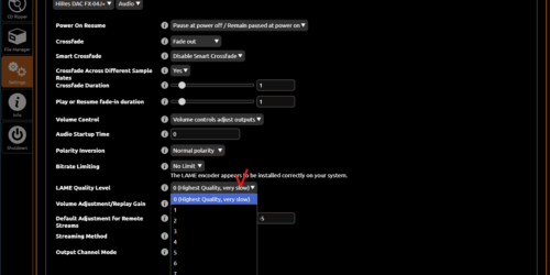 (4) 音が「こもった」感じmp3音源の音質が悪く、クリアに聞こえないSettings>Advanced Media Server Settings> Player>Audio>LAME Quality Level
